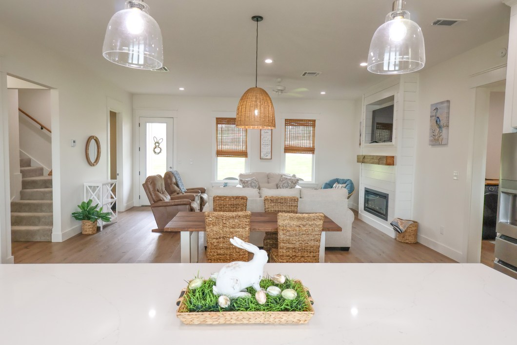 Indulge in the essence of refined lakefront living with the effortless turn of a key. This newly built masterpiece exudes quiet sophistication across its 2,300± sq ft of impeccably curated space, where every detail has been thoughtfully considered and flawlessly executed. From the moment you step inside, that coveted “brand‑new home” ambiance surrounds you-crisp, pristine, and meticulously finished from the foundation to the attic. Enhanced with spray‑foam insulation, the residence offers exceptional energy efficiency without compromising comfort or style. Beyond the front door, an expansive, light‑filled layout unfolds, anchored by an inviting family room with a statement fireplace. The dining area and generous breakfast bar create a seamless flow for both intimate gatherings and effortless entertaining. The kitchen is a showpiece in its own right, elevated by stunning quartz countertops, abundant cabinetry, and extensive counter space that rises to meet the impressive 10′ ceilings. A spacious walk‑in pantry adds a touch of everyday luxury. A sweeping wall of windows frames mesmerizing water views, bathing the interior in natural light and infusing the home with warmth and tranquility. The oversized 28×20 carport, complete with a 20×8 storage room, offers versatile space ideal for a workshop, lake gear, or lawn essentials. With two bedrooms on the main level and two additional bedrooms upstairs, the home provides generous accommodations for family and guests seeking comfort and relaxation. Step onto the covered back porch and continue to the expansive 22×20 wooden deck-an outdoor sanctuary designed for hosting unforgettable gatherings or savoring peaceful mornings with coffee in hand as nature unfolds around you. Perched on a 0.0767± acre lot, the property boasts sweeping, unobstructed views that stretch gracefully across the lake and into Texas, creating a breathtaking backdrop for everyday living.