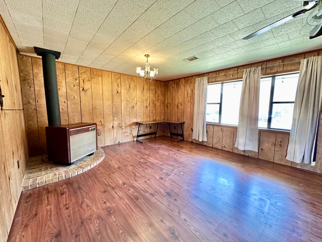 (Photos were taken prior to the current tenant’s occupancy, the home is currently occupied and furnishings may differ.) This cozy 2-bedroom, 1-bath home is the perfect place to start your homeownership journey! Nestled on a gorgeous fenced one-acre lot, this property offers plenty of space to enjoy the outdoors, making it ideal for kids or pets to play safely. Relax on the 18×8 covered porch and take in the peaceful surroundings. Inside, you’ll find a spacious kitchen and a large living room, perfect for gatherings or relaxing evenings. The roof was completely replaced in 2023 for added peace of mind. The property also features a shed with electricity, providing extra storage or a potential workshop space. A garage/carport ensures convenient parking.